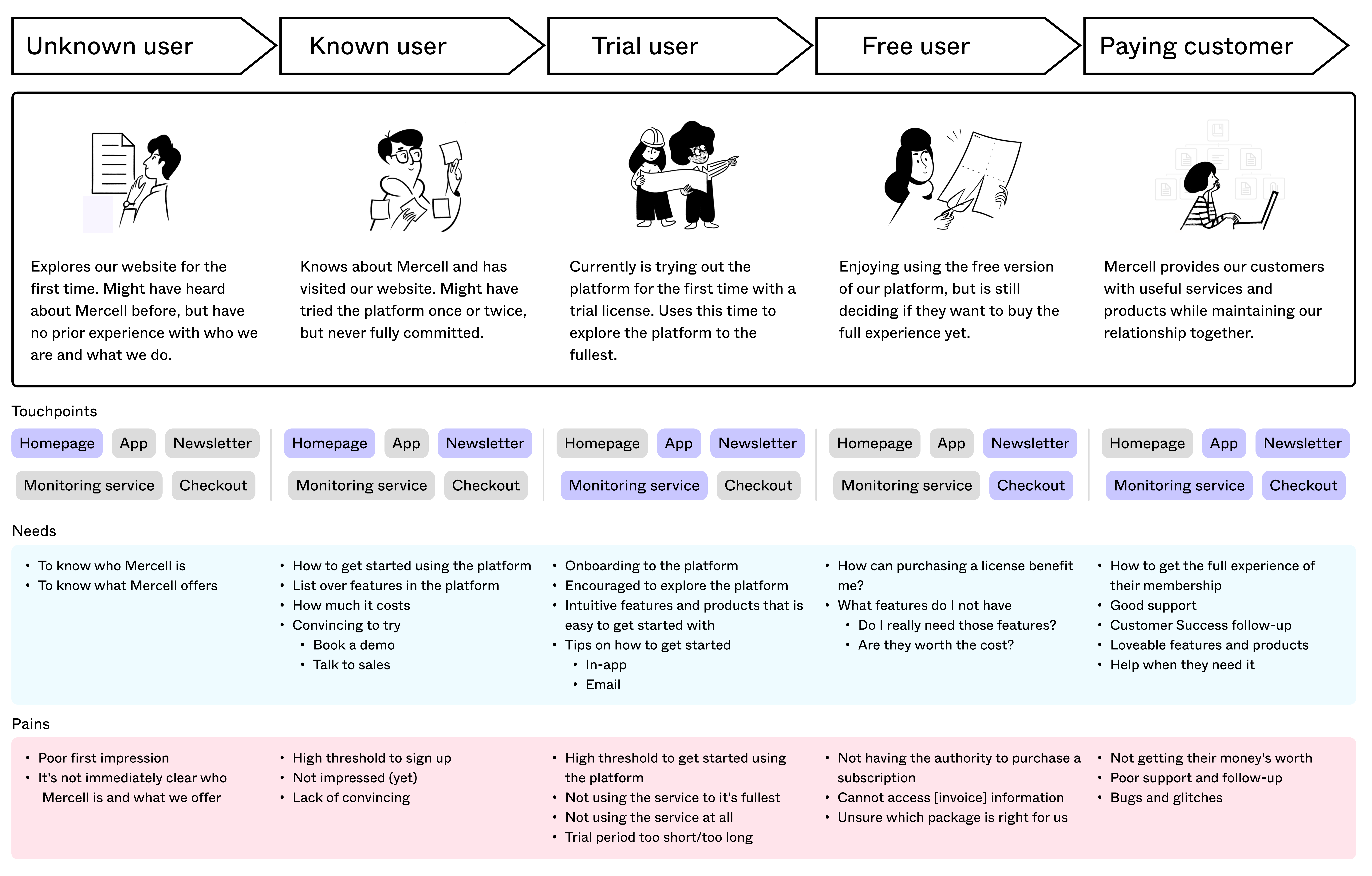 In our user journey, the user can have different roles at different stages. The goal is to funnel them to the next role, for them to end up as a paying customer.